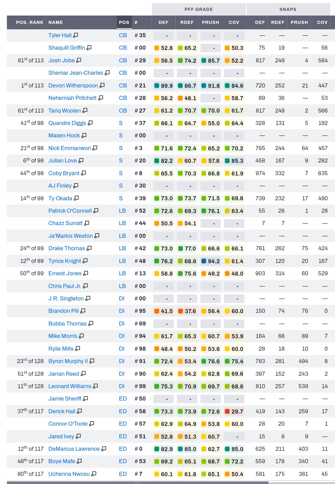 Since I had to sign up for PFF Plus in order to get all the grades for scoring the rookie prediction contest, here are the season grades...